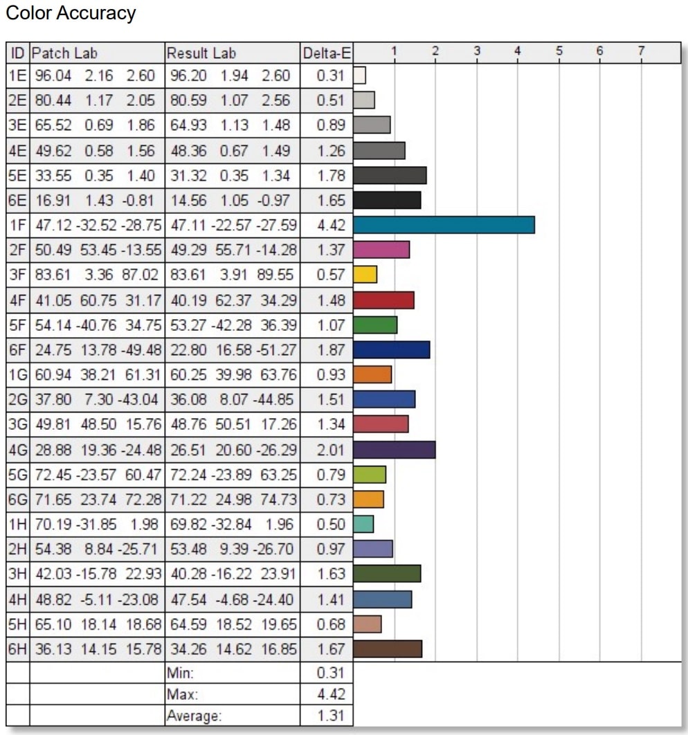 Calibrating it with the Calibrite DisplayPlus reduced the deltaE average to an astounding 0.4. Most of the errors in the calibrated state are on the white and black patches, but that’s primarily because of the low contrast ratio on IPS panels. Note that you must buy a colorimeter to get the same output since copying ICC profiles or RGB settings will not guarantee the same results.