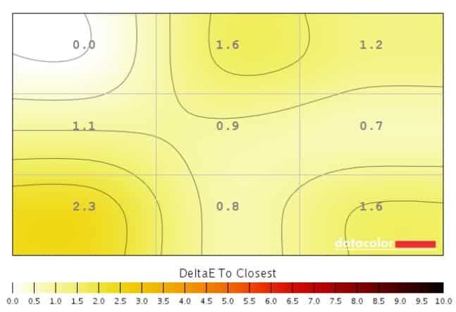 Panel quality for the BenQ EX3203R is middling at best due to some backlight uniformity issues. The upper left quadrant of the screen is noticeably dimmer than the rest, but it’s not as noticeable when watching movies or enjoying games. Color uniformity is mostly unaffected since variance from the ideal D65 did not exceed Delta 2.3.