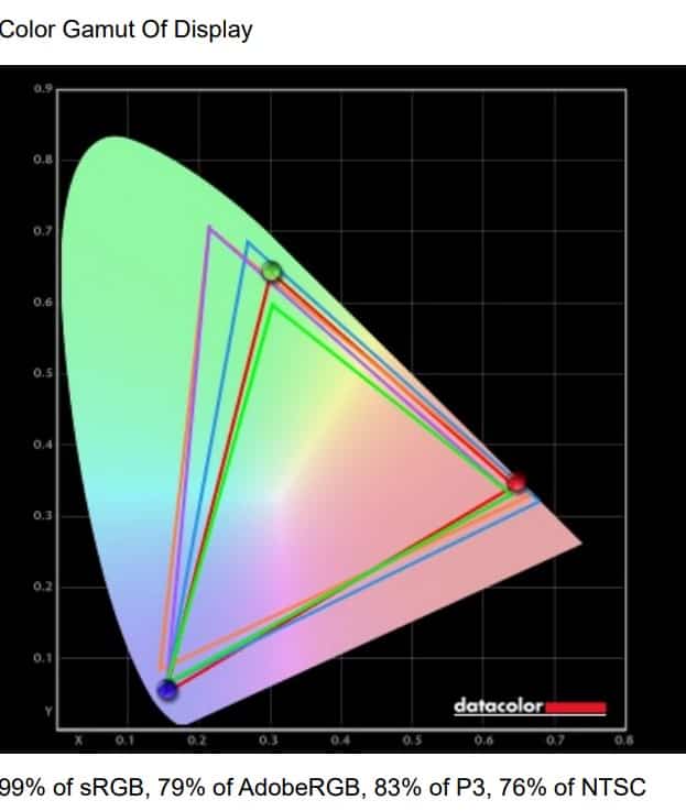 The BenQ Mobiuz EX2710 pours out 99% sRGB gamut coverage and 83% for DCI-P3 which is decent for games and general use. However, accuracy is slightly over the place with a deltaE average of 3.84 which makes deviances noticeable. Its caused by high errors in grayscale and in the gamma curve, so the monitor could use some tweaking.